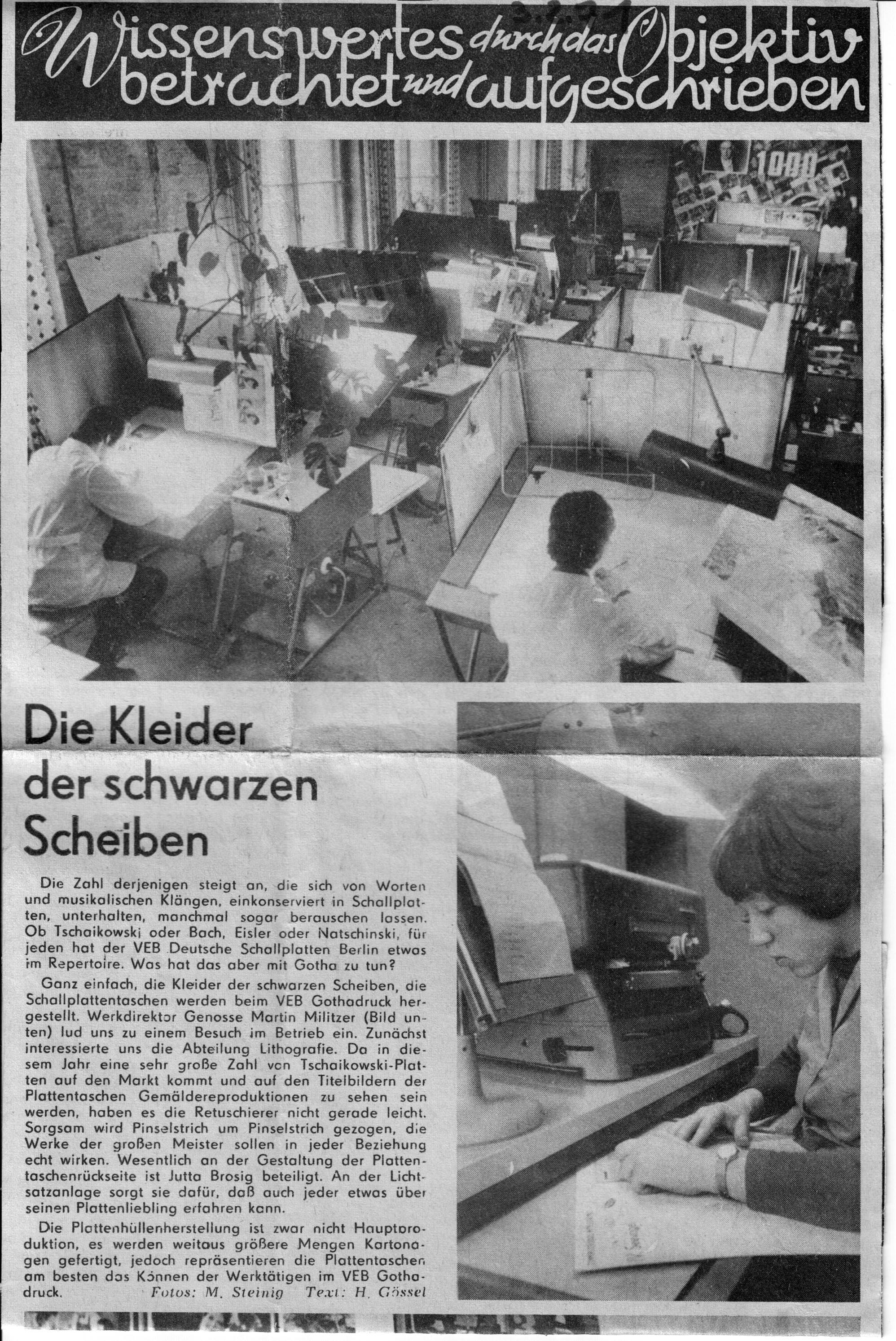 Die Aufgabe der Mitarbeiter*innen des VEB Gotha Druck bestand darin, die Schallplattenhüllen für die VEB Deutsche Schallplatten Berlin zu bedrucken. Die Entwürfe wurden von Grafiker*innen geliefert und mittels Off-Set-Druck, also indirektem Flachdruck, realisiert. Gudrun Bernkopf war in diesem Prozess für die Retusche zuständig. Dass sie ihr Handwerk eigentlich an Buch und Werbezetteln gelernt hatte, stellte für sie keine Herausforderung dar: »Wenn man das einmal gelernt hat, ist es egal, was man macht, ob Schallplatte oder Bücher.«