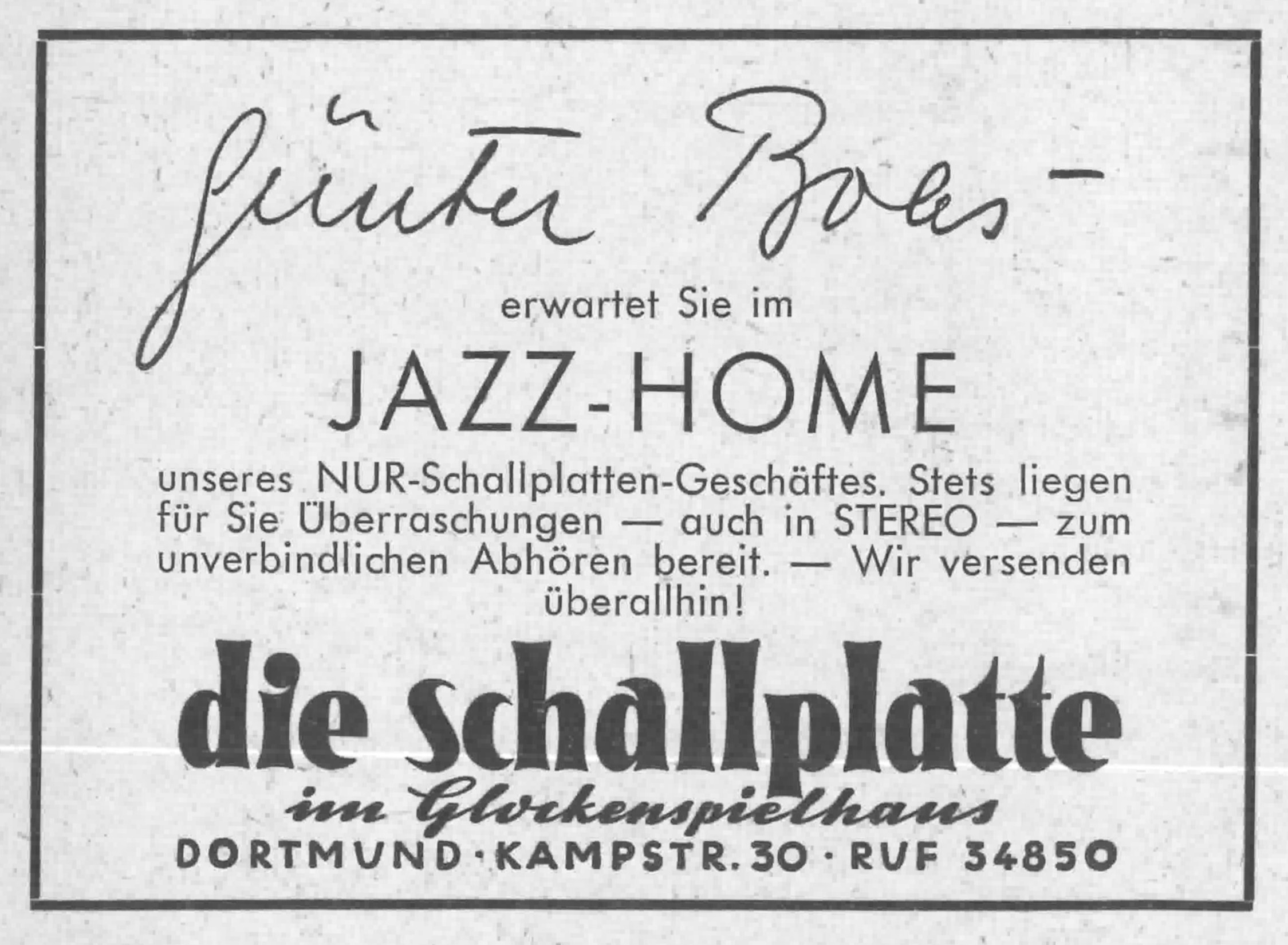 Die Ära der Jazz-Titel im Plattenladen ›Die Schallplatte‹ ging bereits zu Beginn der 1960er-Jahre jedoch wieder zu Ende. Was blieb, war die Bedeutung von Boas für Dortmund als Jazz-Standort. Gemeinsam mit dem bis heute existierenden Musikhaus Schlüter, das Instrumente und einen ebenfalls durchkonzipierten modernen Verkaufsraum für Schallplatten anbot (vgl. ebd.), stellte ›Die Schallplatte‹ das Zentrum einer jungen Tonträgerszene in einer Stadt dar, die sich selbstbewusst als »die neue Metropole des Jazz« sah (vgl. Düdder zit. in ebd.: 63).