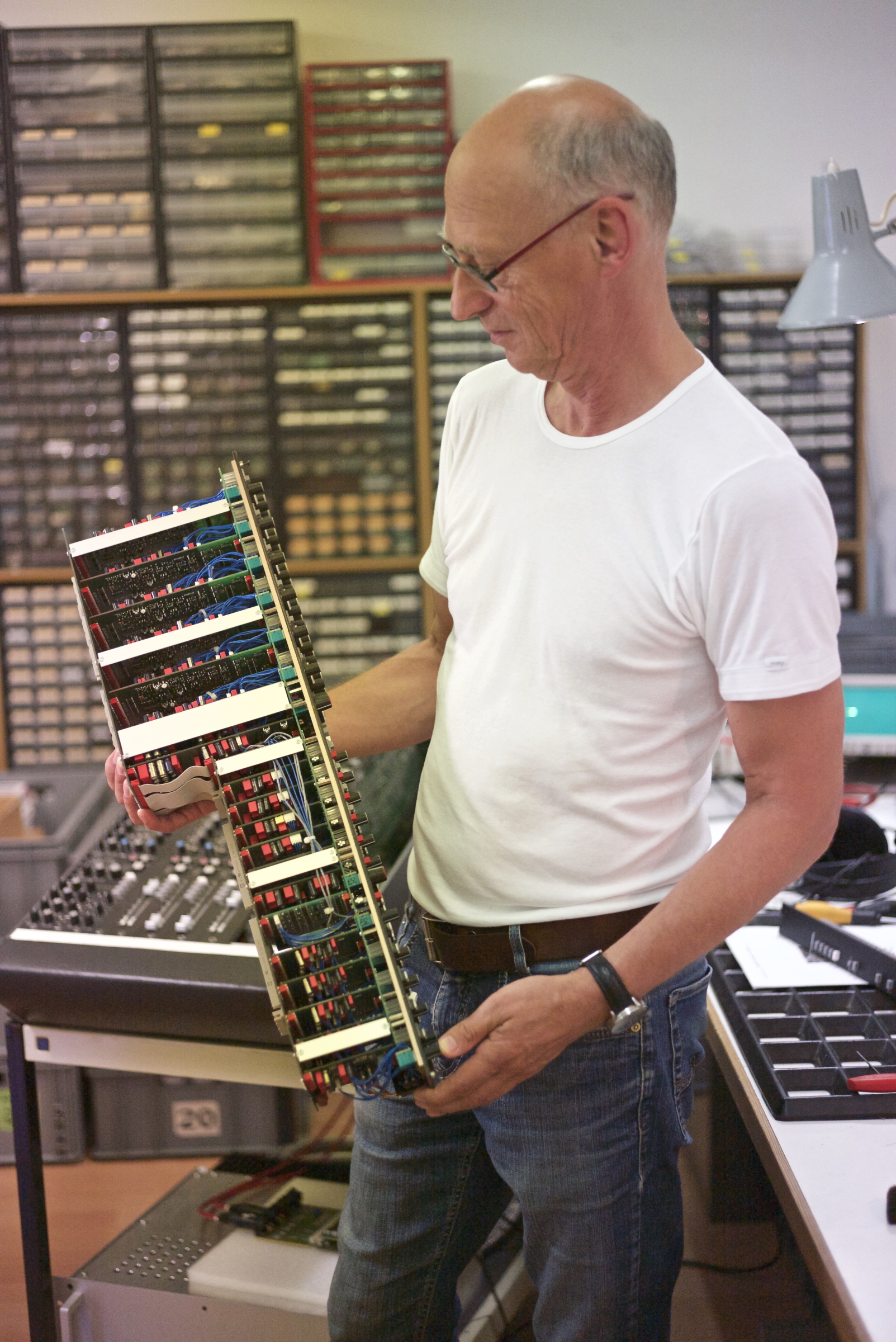 Ich weiß noch, wie schwierig es am Anfang war, eine einfache Schaltung mit ein paar Bauteilen ans Laufen zu bringen. Jetzt sind in einem AM-1 Mischpultkanal 2500 Bauteile, im gesamten Pult diese Zahl mal zweiunddreißig oder mehr plus Master Modul und alles funktioniert und fliegt nicht auseinander. Ich glaube ich bin bei der Entwicklung eher vorsichtig und konservativ, aber das war die einzige Chance, die ich hatte. Jedes meiner Designs musste ja funktionieren. Ich war ja nicht in der Situation wie ein großer Hersteller, wo erst mal einige Prototypen gebaut werden um zu sehen, ob die Schaltungen laufen. Meine Mischpulte mussten damals auf Anhieb funktionieren.