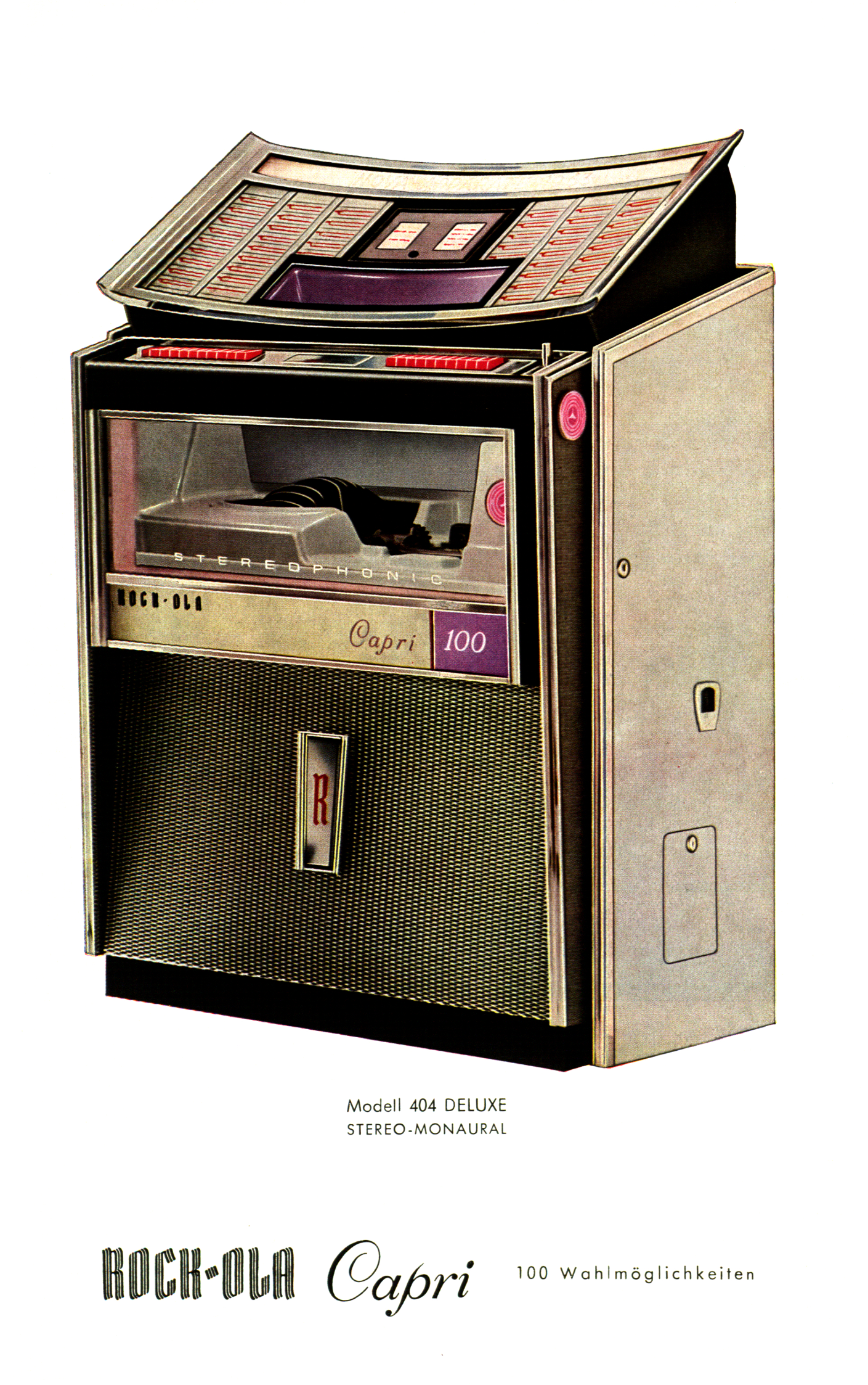 Die Jukebox war in den 1950er- und 1960er-Jahren in Westdeutschland äußerst populär, sorgte aber auch für erhitzte Gemüter. Während sie zeitweise zur Grundausstattung von Cafés und Kneipen gehörte, geriet sie zugleich fortlaufend ins Kreuzfeuer der Kulturkritik. Man störte sich an den grellen Farben, an den ausladenden Formen und vor allem an der vermeintlich schamlosen Ökonomisierung des Musiklebens – schließlich spielten Jukeboxes erst nach Münzeinwurf Musik ab. Nach der rasanten Ausbreitung der ›Musik-Roboter‹ stellte sich bereits Mitte der 1960er-Jahre eine Marktsättigung ein, infolge derer das Interesse an den Geräten sukzessive nachließ. Die Rock-Ola Capri 100, Modell 404, wurde 1963 auf dem westdeutschen Markt eingeführt und zählte damit schon zu den späteren Modellen, die hierzulande erfolgreich vertrieben wurden. Neben Wurlitzer und Seeburg gehörte Rock-Ola zu den größten US-Exporteuren von Jukeboxes, die die Geräte nach Westdeutschland brachten und den dortigen Markt dominierten.