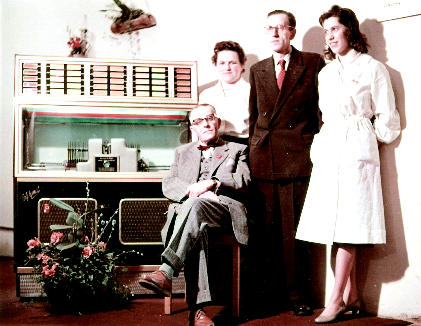 Für die Produktion der Polyhymat-Jukeboxes zeichneten der Unternehmer Julius Görner und der Ingenieur Heinz Hebestreit verantwortlich. Görner hatte schon vor dem Ende des Zweiten Weltkriegs Musikautomaten aufgestellt und betrieben. In den 1950er-Jahren gelang es ihm dann, Jukeboxes aus den USA in die DDR zu importieren. Als vonseiten der Regierung beschlossen wurde, Jukeboxes in volkseigenen Betrieben produzieren zu lassen, wurde Görners Musikautomatenbetrieb unter der Ägide des VEB Funkwerk Erfurt im Dezember 1959 mit dieser Aufgabe betraut. Indes konnte Görner in seinem eigenen Betrieb keine Serienproduktion leisten, woraufhin die Polyhymat-Modelle alsbald im Erfurter Funkwerk hergestellt wurden (vgl. Rosenblath o. J.: o. S.). Abbildung 3 zeigt Görner (links vorne) gemeinsam mit Hebestreit sowie zwei namentlich nicht genannte Mitarbeiterinnen, Görners Sekretärin und einer technischen Zeichnerin, auf der Leipziger Frühlingsmesse 1960 vor dem Modell Polyhymat 60A (das weiterentwickelte Modell 80E zeigt sich auf der Abbildung 4).