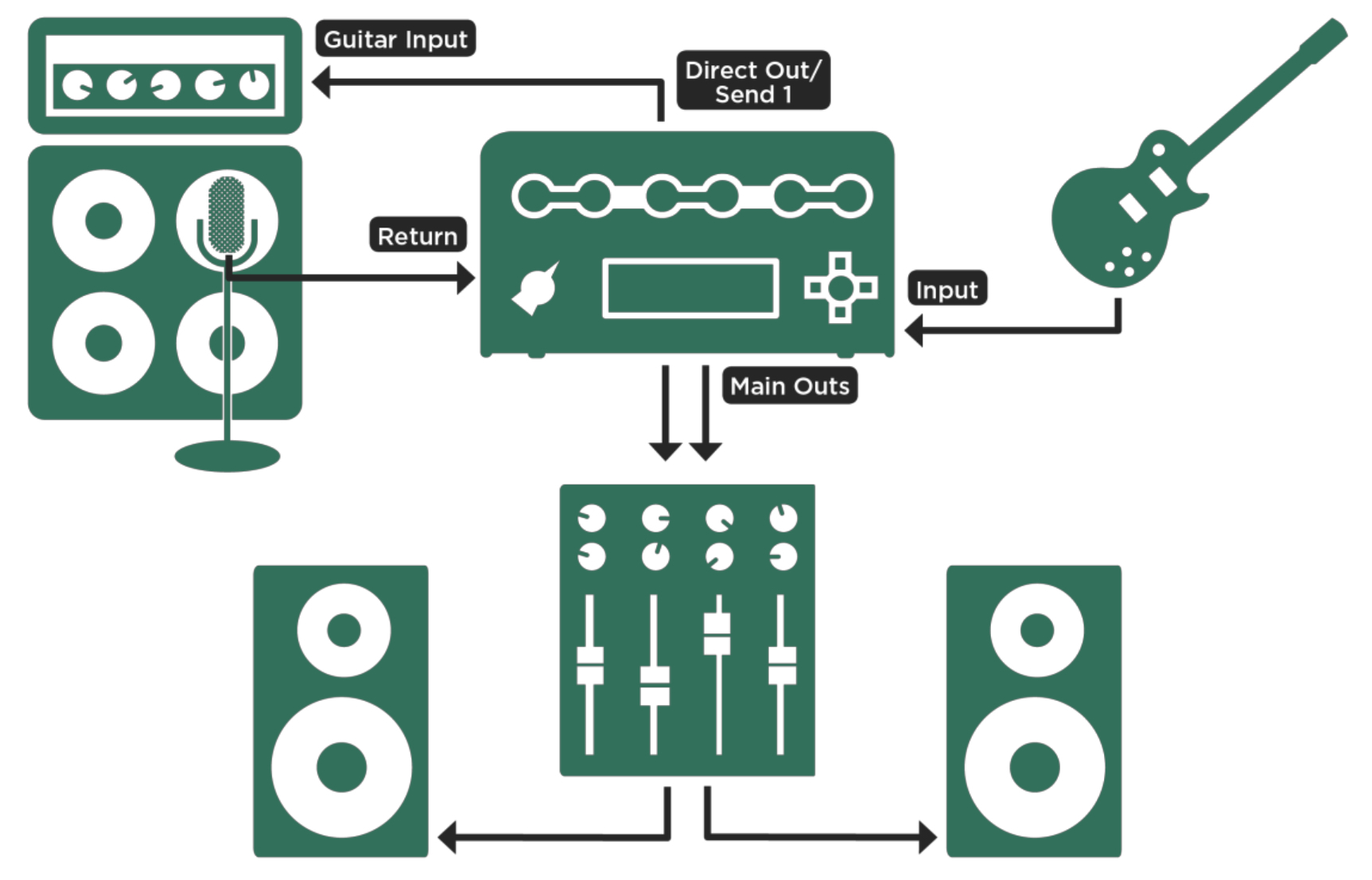 Auf der oberen Seite der befinden sich weitere Funktionen in der Reihenfolge des ›klassischen‹ Signalweges vom links startenden Input zum Output auf der rechten Seite. Dieser beginnt mit den Bodeneffekten, die üblicherweise in der physischen Anordnung zwischen E-Gitarre und Verstärker eingeschliffen sind, dem »Stack«, also dem eigentlichen Verstärker, sowie den Kabinetteinstellungen und den (Studio-)Effekten, die das Endsignal modulieren.