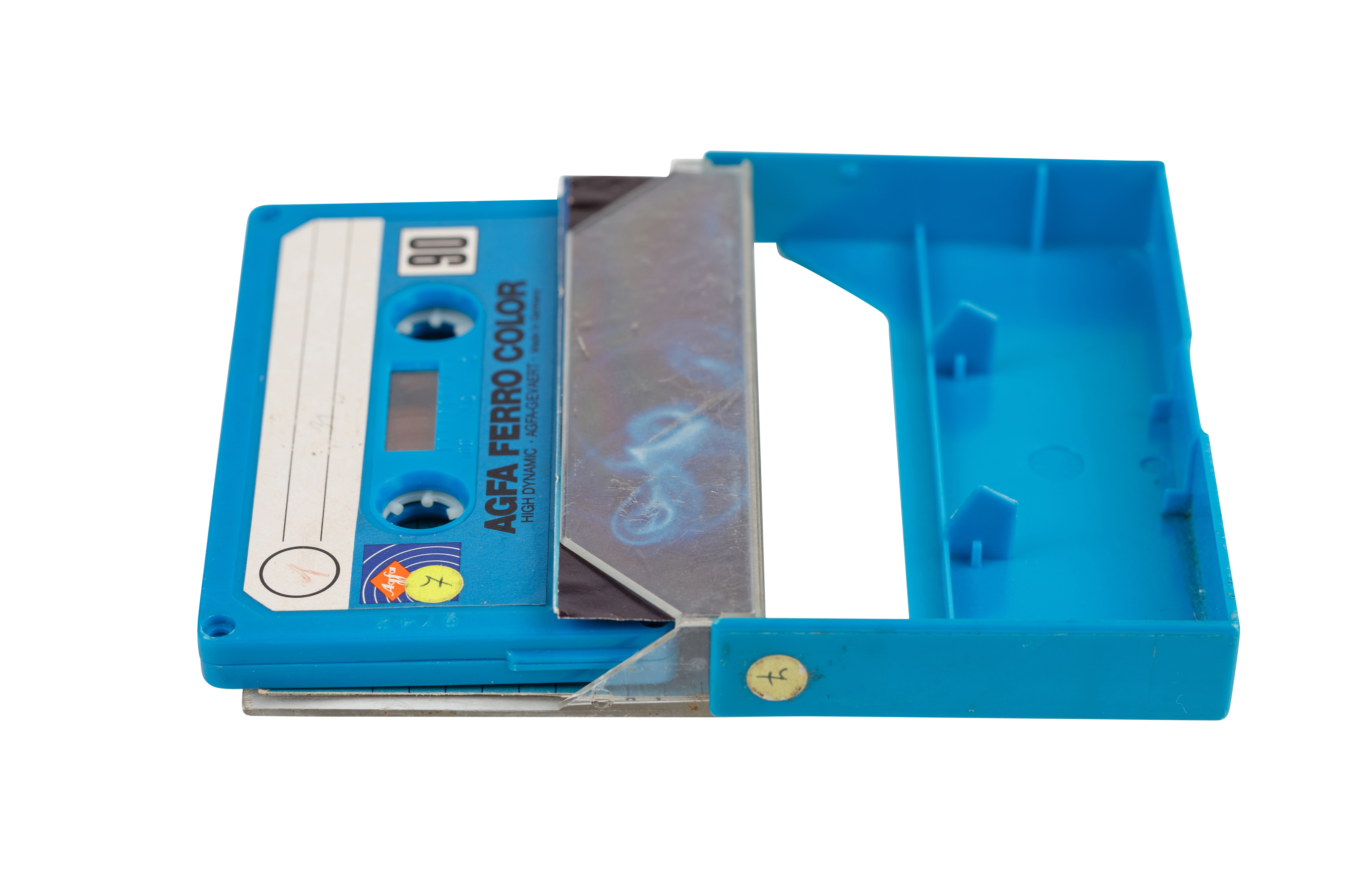 Abb. 2: ​ Die Vorderseite und das Cover des Leertonbands sind nicht beschriftet, die Hülle ist allerdings mit schwarz-blauem Karton beklebt.