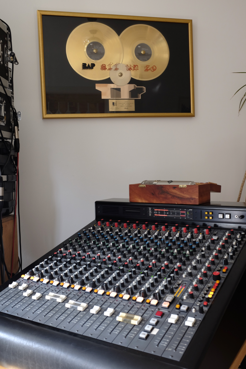 Abb. 3: Angerhausens Mischpult in ihrem Homestudio. Dazu die goldene Schallplatte von BAPs aff un zo, an der sie mitgearbeitet hat. Brigitte Angerhausen.
